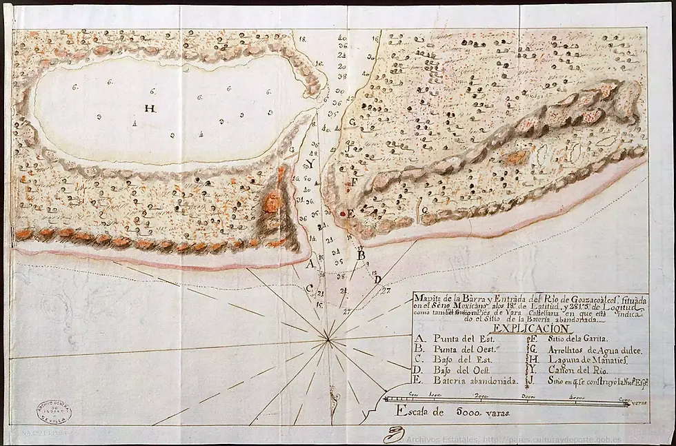 "Mapita de la Barra y Entrada del Río de Goazacoalcos situada en Seno Mexicano á los 18º de Latitud y 281º 5' de Longitud, como también el sondeo en Piés de Vara Castellana, en que está indicado el Sitio de la Batería abandonada"