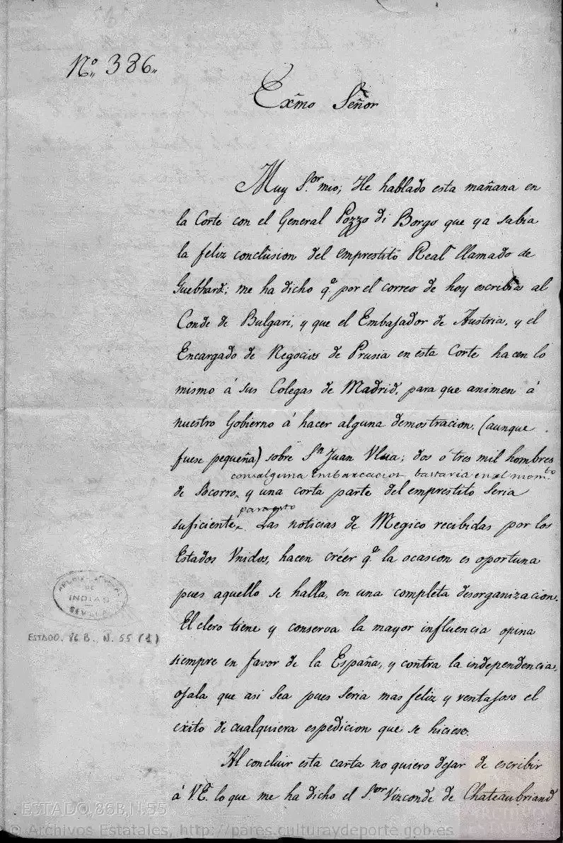 Carta nº 58 de Francisco Lemaur, capitán general y jefe político de Nueva España, al secretario de Estado de la Gobernación de Ultramar, remitiendo copia del párrafo de una carta de sus confidentes que acredita las disposiciones de los vasallos del rey en