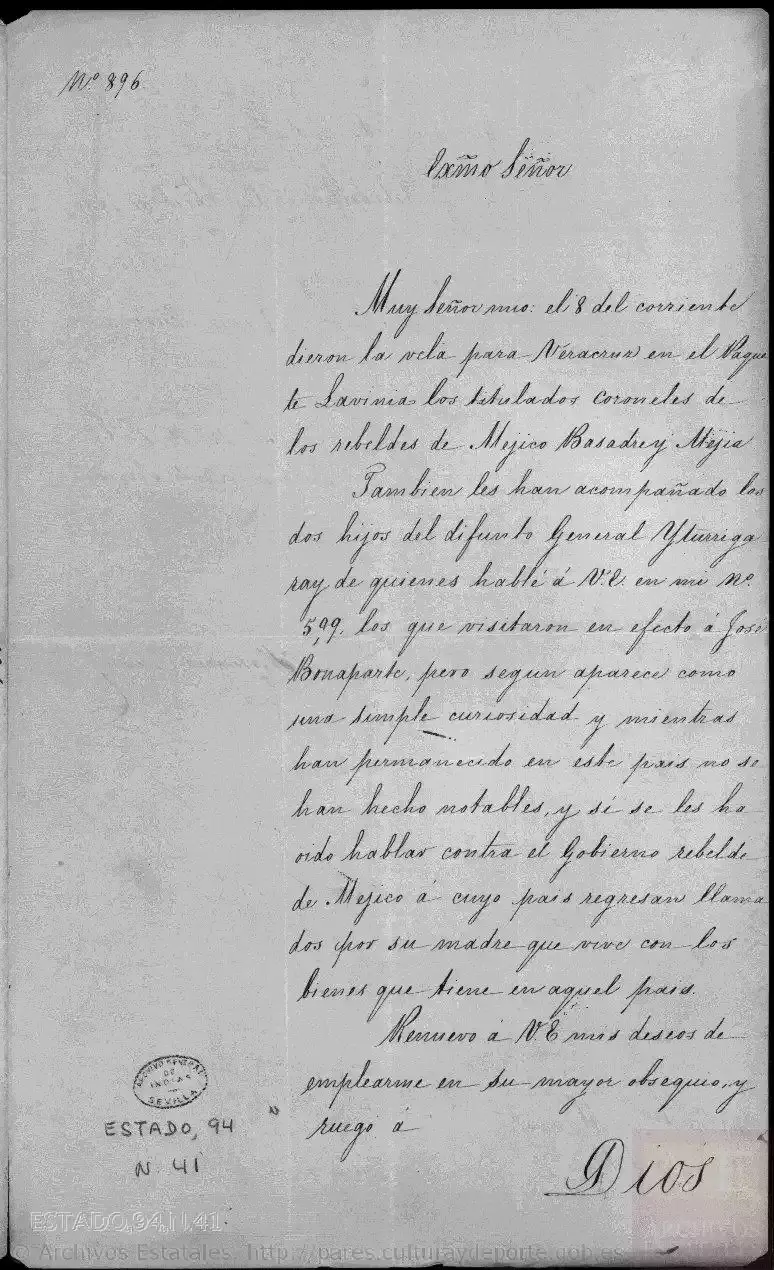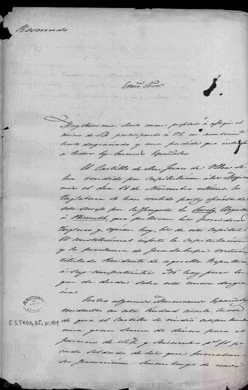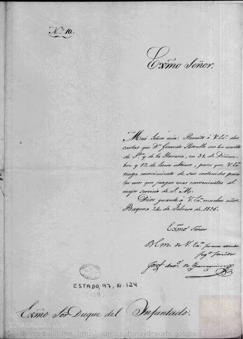 Carta de José Antonio Azlor de Aragón, duque de Villahermosa, embajador en París, al Pedro Alcántara de Toledo, duque del Infantado, ministro de Estado, dando cuenta de la rendición del castillo de San Juan de Ulúa a los mexicanos el 18 de noviembre de 18